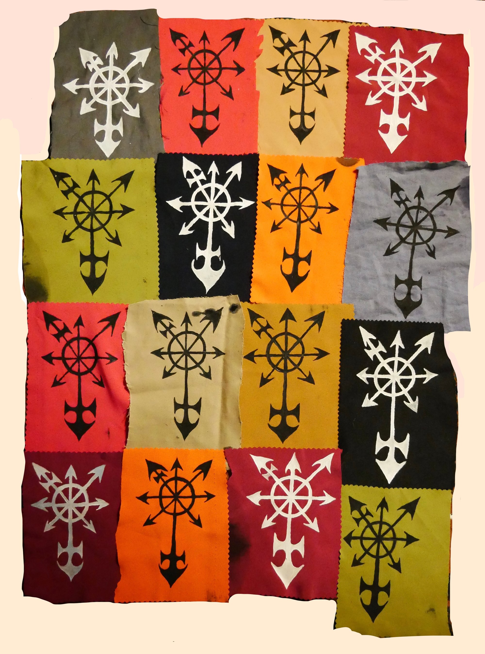 Hand-painted patches with a TRANARCHIST sigil - a fusion of the Transsexual symbol and the Chaos symbol.